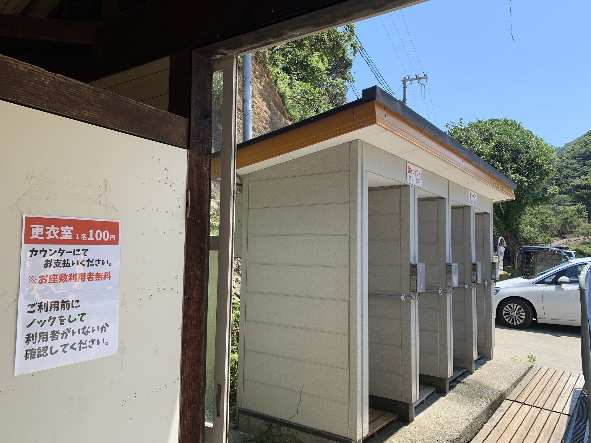 まる屋からすぐ目の前にも浜はありますが、現在海水浴場としては開設していません。今回はシャワー施設や軽食ができる海の家があり、小さな子供も安心して遊べる今子浦海水浴場へ。