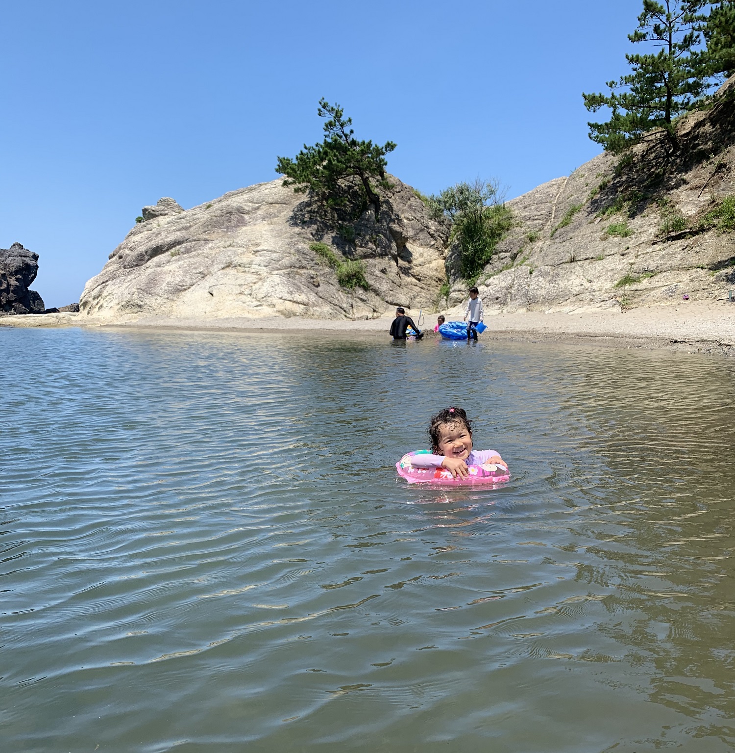 今子浦海水浴場は、かえる島がある場所。最寄りの駐車場の利用料金は500円です。平日ということで、海水浴をされている方は少なめ。周りを気にせず、ゆったりと楽しめました。3歳の娘も浅瀬でパチャパチャ水遊び。ちょっと深いところへ連れて行こうとすると「いやー!」と怖がってました^^;泳いだり潜ったりできるのはもうちょっと先かなぁ~